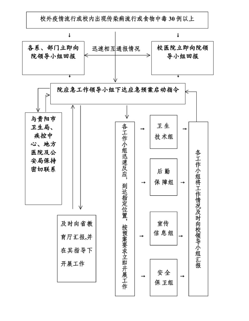 各系、部门(单位)或个人在发现校内发生或可能发生突发公共卫生事件的,都有及时报告的责任和义务。学院接报后应迅速组织调查核实。经调查核实确属突发公共卫生事件的,由学院宣布启动应急预案。国内或区域内出现重大疫情可能会影响到学院的,也应按要求启动应急预案。应急启动等级参照《国家突发公共卫生事件应急预案》或《贵州省重大食品安全事故应急预案》规定从严掌握执行。
