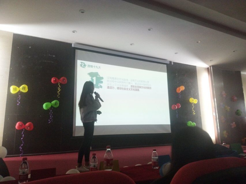 而后丁老师为本次活动致辞。表达了对在座嘉宾及前来观看的同学的感谢。再次强调了本次活动主题“学习十九大精神”。希望各位同学能够跟随党的步伐,贯彻党的精神。最后预祝此次活动顺利完成。