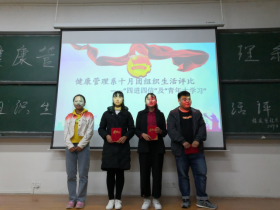健康管理系学生会副主席袁宇婷致闭幕词,她说:感谢同学们对此次团组织生活评比的付出与努力,今天的参赛选手表现很优秀,希望同学们再接再厉,我相信下个月的团组织生活评比同学们会做得更好。