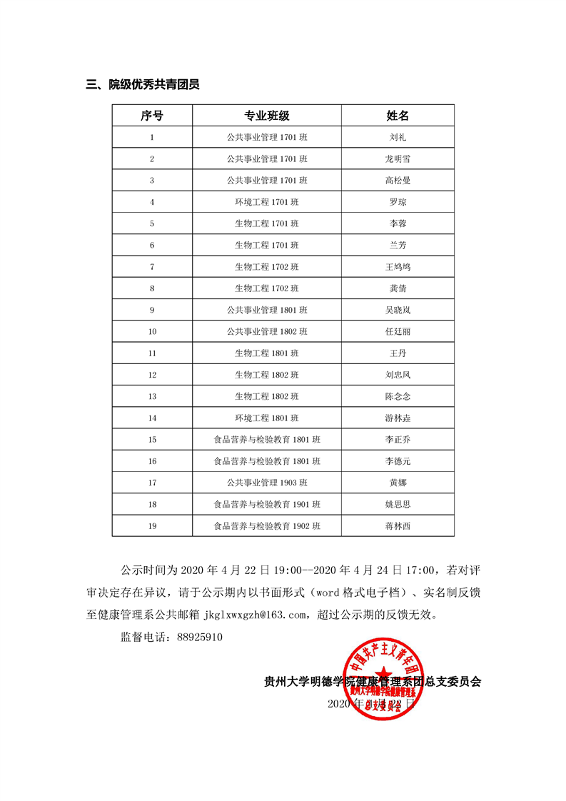 健康管理系关于推荐贵州大学2019-2020学年优秀团支部、优秀共青团员、优秀共青团干部的公示