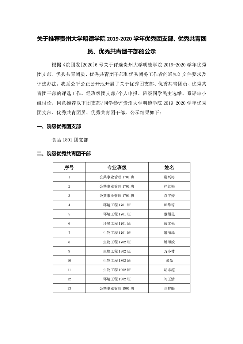 关于推荐贵州大学明德学院2019-2020学年优秀团支部、优秀共青团员、优秀共青团干部的公示