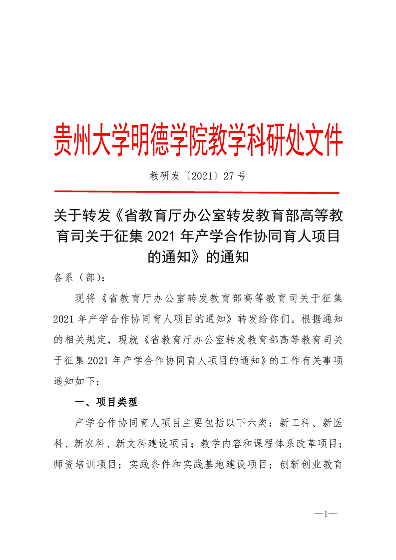 关于转发《省教育厅办公室转发教育部高等教育司关于征集2021年产学合作协同育人项目的通知》的通知