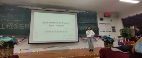 活动开始,各班参赛选手围绕主题进行讲解,在比赛过程中解说员不仅表达出对活动主题内容的深刻理解,还展示了各种精彩绝伦的手工艺品:建筑2001班的毛笔画、工管2002班的发簪、造价2001班的剪纸等。