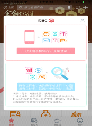 b:持有工行卡但未注册手机银行的客户点击蓝色区域进行注册。