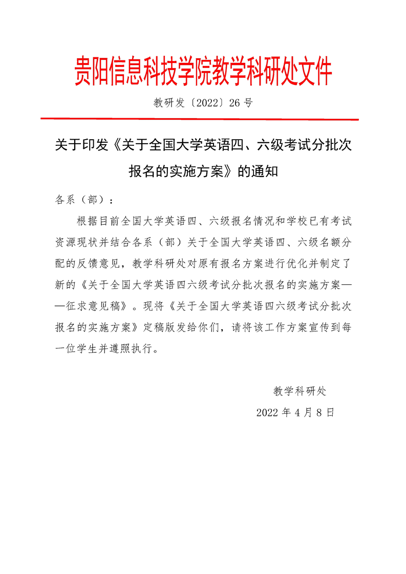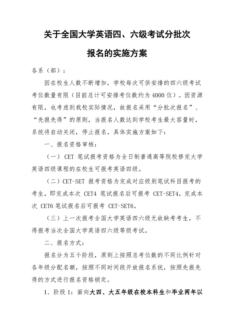 关于印发《关于全国大学英语四、六级考试分批次报名的实施方案》的通知
