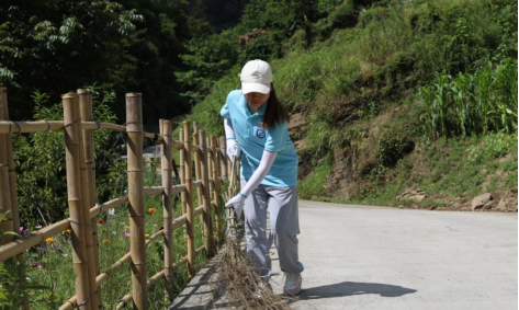 图为队员为大寨村清扫路面垃圾