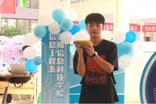 信息工程系迎新工作点以“水果伴作礼物·寓意寄托祝福”为主题,以五种类型水果寓祝福之意,为远道而来的新生学子及其家长们送上信息工程系师生诚挚的祝福与欢迎。五种水果中柿子寓意“事事如意”、橙子寓意“心想事成”、苹果寓意“平平安安”、芒果寓意“光芒万丈”、梨子寓意“大吉大利”,且均放置字牌予以标识。每位新生可任选自己喜欢的水果类型,并在自己敲下的一声清脆锣响中开启寓意美好的新学期。