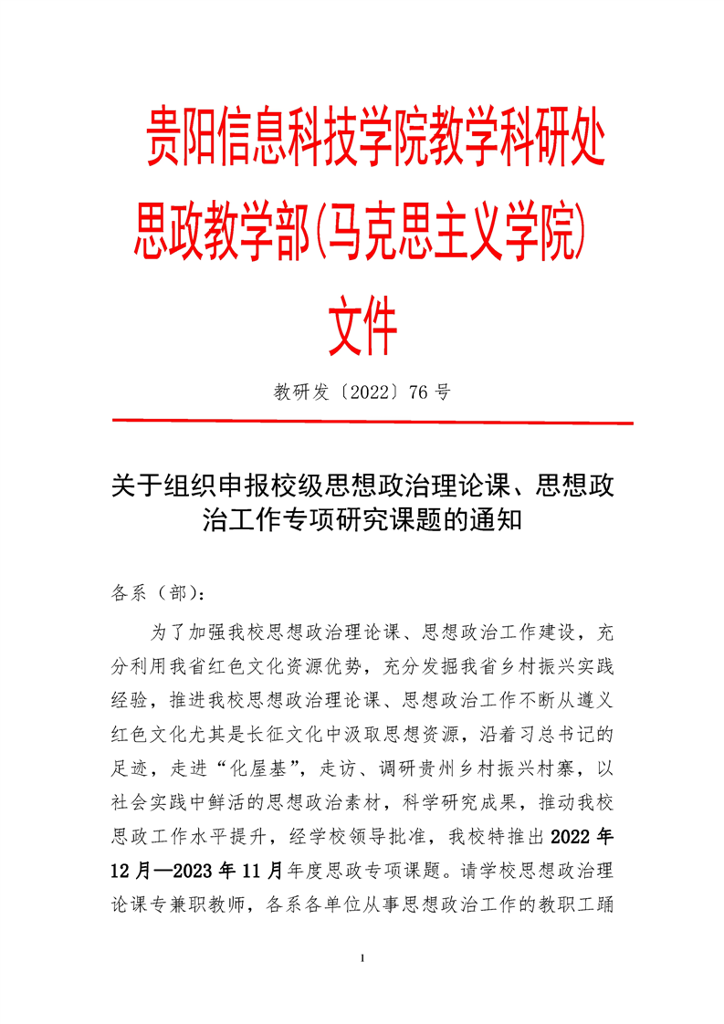 关于组织申报校级思想政治理论课、思想政治工作专项研究课题的通知