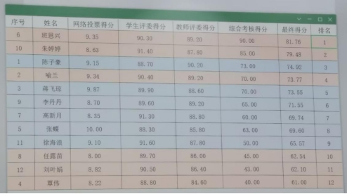 经过12位候选人的精彩分享和答辩,评委团本着“公平、公正”的原则为12候选人进行打分,综合网络投票分数,最终评选出经济管理系“泰豪之星·十佳大学生”——班恩兴、朱婷婷、陈子豪、喻兰、蒋飞琼、李丹丹、高新月、张蝶、徐海浪、任露苗。