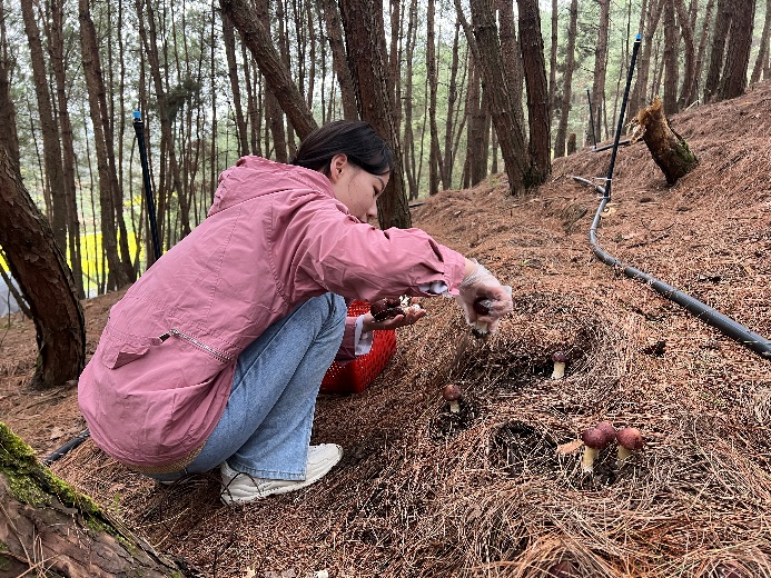 23日早8时30分,beat365中文官方网站经济管理系师生7人来到曹家庄村赤松茸种植基地。在驻村第一书记王天鹏的介绍下,志愿小队了解到平均海拔约1200米的曹家庄村因地制宜,立足特色资源,利用林地优势,发展林下经济——赤松茸产业。在进一步的交谈中,志愿队得知三月正值赤松茸春收时节,如不及时采摘,会对赤松茸的品相造成严重影响。撸起袖子就开始干!茂密的松林下,一个个忙碌的身影行走在沟垄间,不时弯腰蹲下,轻轻拨开耸起的松针,探访赤松茸的“藏身之处”,捏住松茸根部,轻轻旋转,抖去泥土,这便完成一次采摘。在志愿者队伍中,既有党员,也有团员,用实际行动诠释当代青年的使命担当。他们热情饱满,充满干劲,不知疲倦。采完一座山头,又去到后山继续采摘。