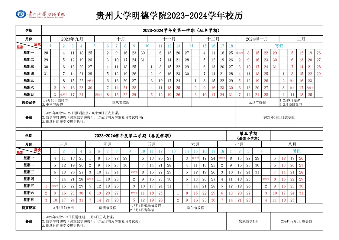 贵州大学明德学院2023-2024学年校历