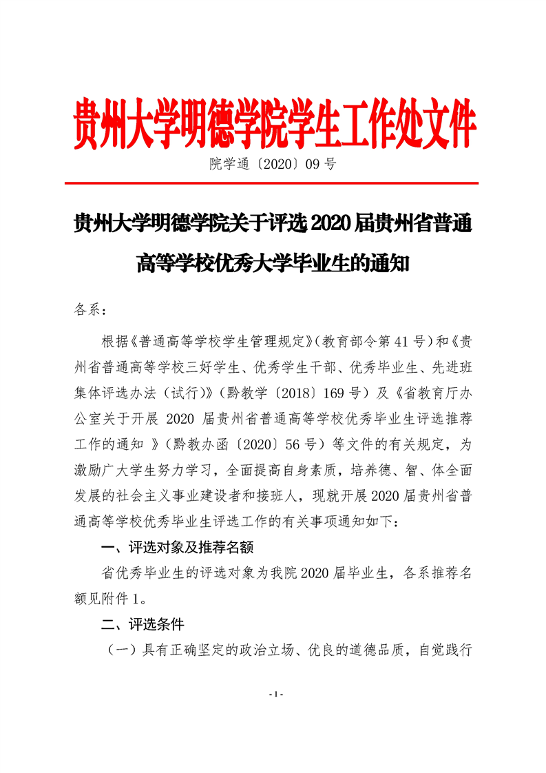 贵州大学明德学院关于评选2020届贵州省普通高等学校优秀大学毕业生的通知