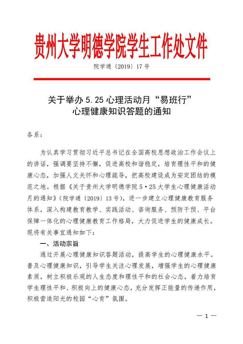 关于举办5.25心理活动月“易班行”心理健康知识答题的通知