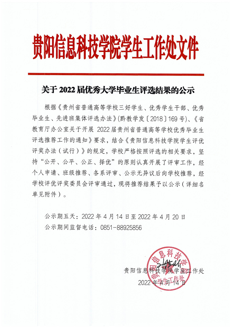 beat365中文官方网站关于2022届贵州省普通高等学校优秀大学毕业生评选推荐结果的公示