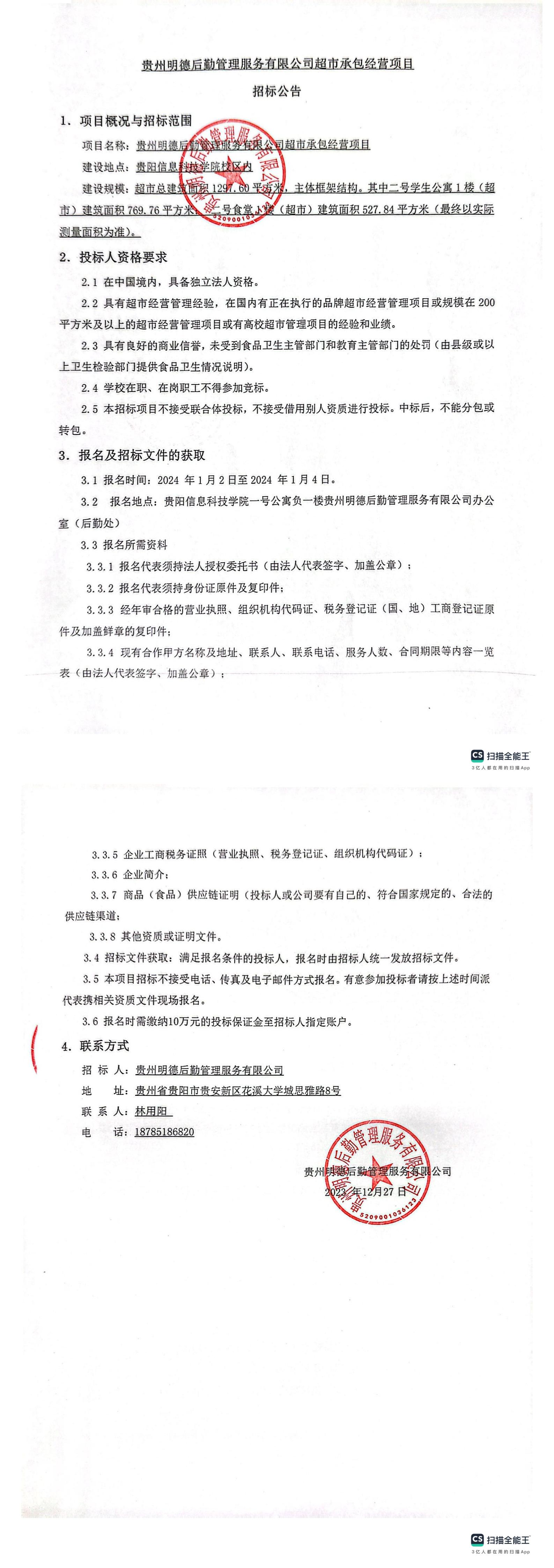 贵州明德后勤管理服务有限公司超市承包经营项目招标公告