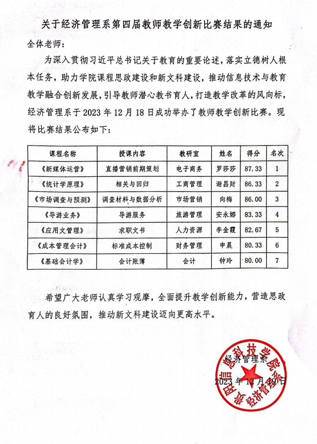 关于经济管理系第四届教师教学创新比赛结果的通知