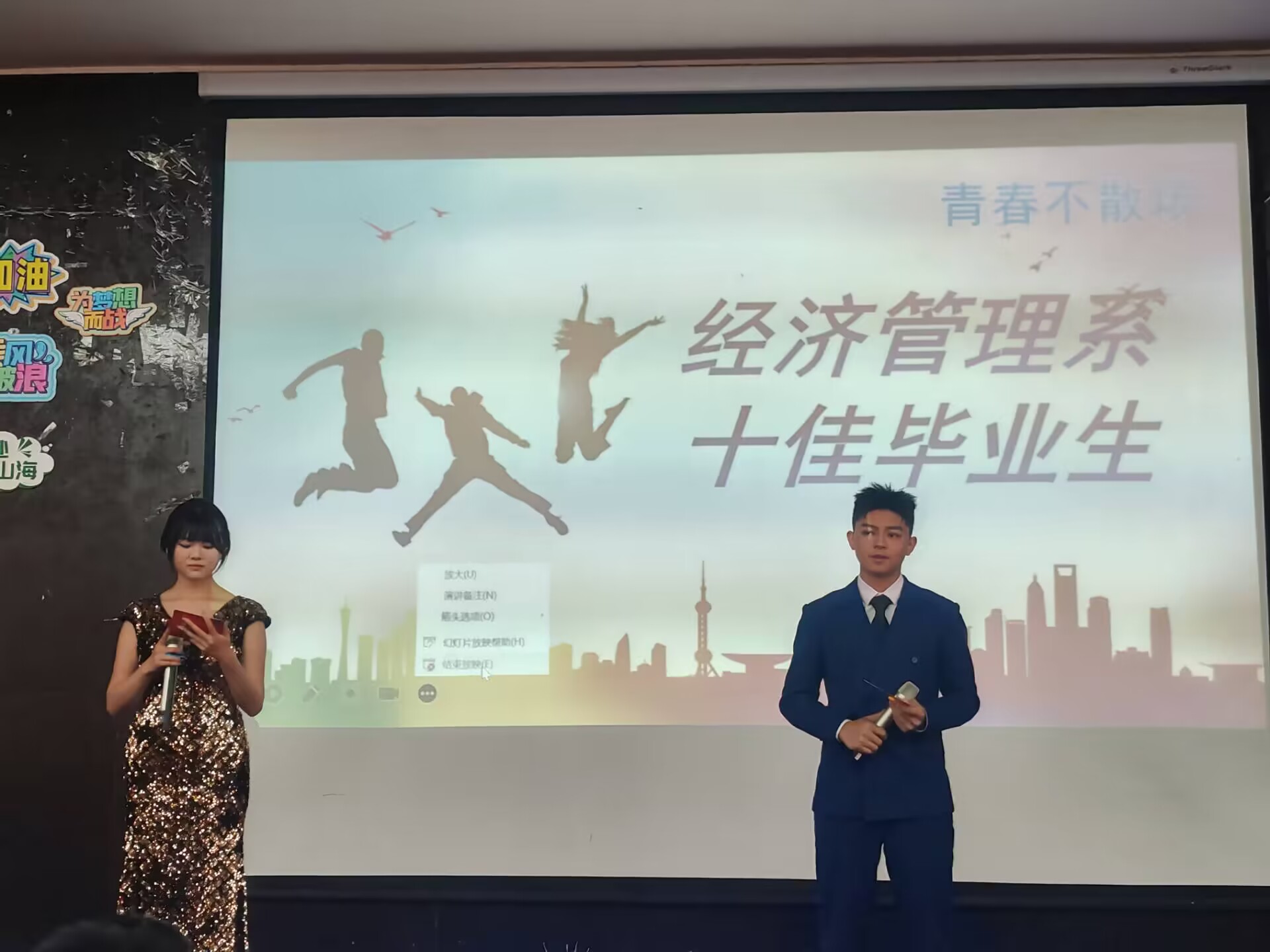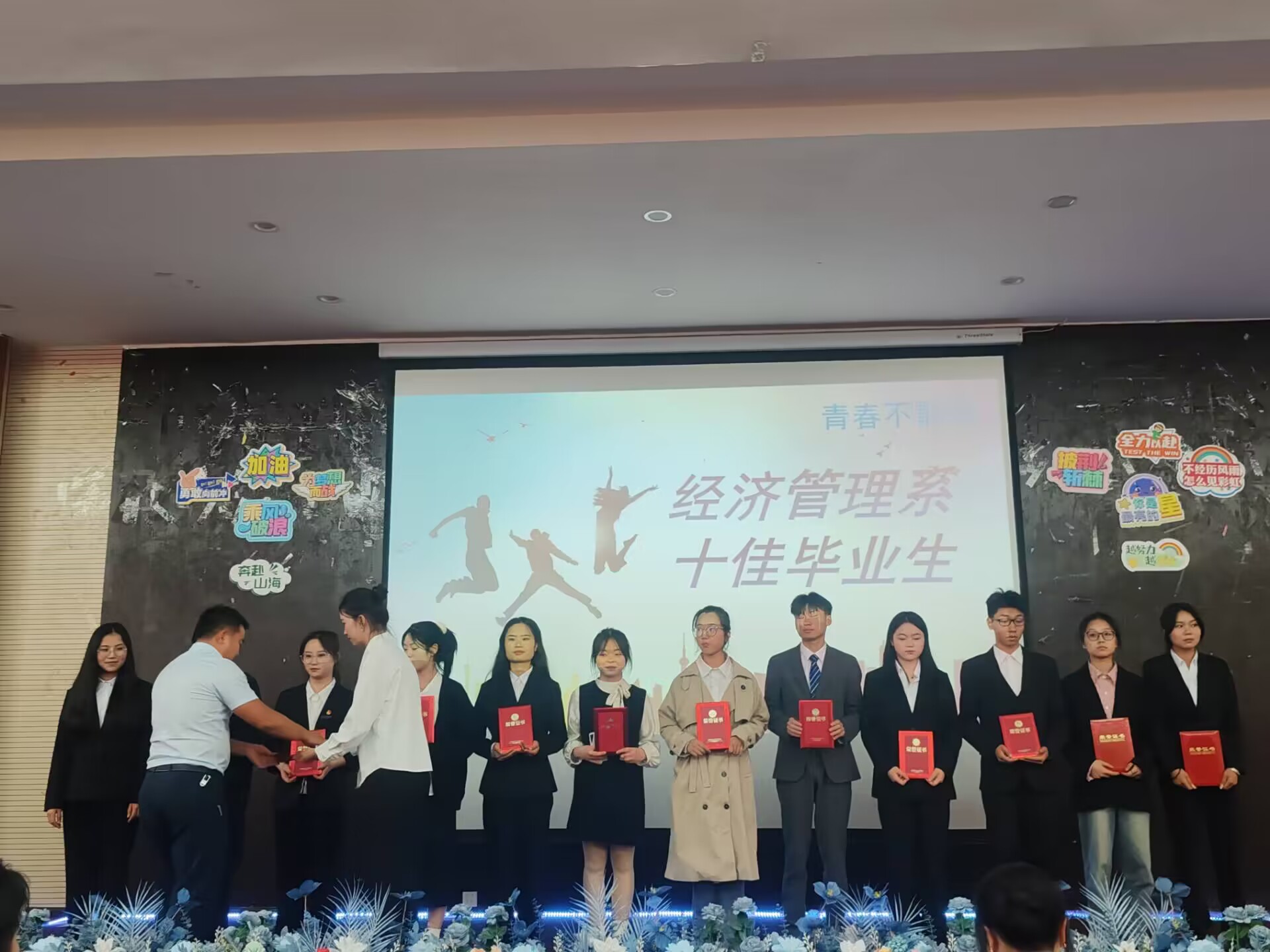 在评审团的综合评估下,最终获得经济管理学院“十佳毕业生”荣誉称号的是罗诗宇,喻兰,万洋娇,徐玉琳,宋培涛,蒋飞琼,杨秀芝,刘智,钟芳蕉,张蝶等十位同学,由张吉林为获奖选手颁发荣誉证书并合影留恋。