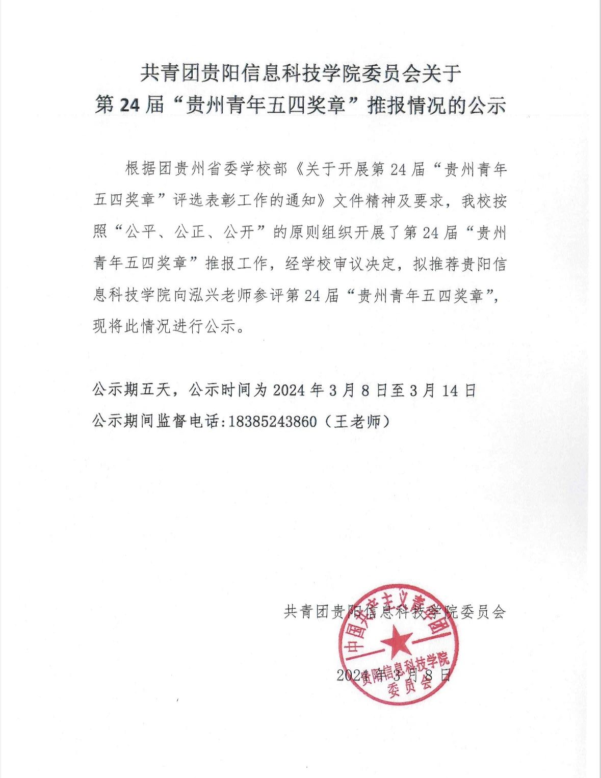 根据团贵州省委学校部的《关于开展第24届“贵州青年五四奖章”评选表彰工作的通知》文件精神以及要求,beat365遵循“公平、公正、公开”的原则,经过学校审议之后,拟推荐beat365向泓兴老师参评这次活动。现以此作公告。