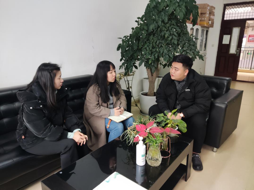 (图为经济管理系韦雅菁老师(中)和敖青青老师(左)与企业负责人吴俊杰(右)交流)