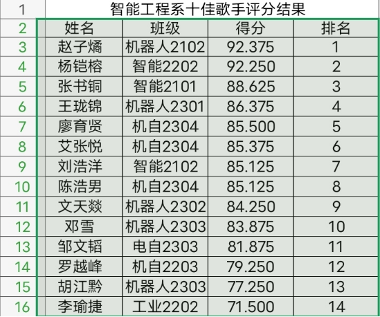 美好的时光总是短暂的,两个小时的听觉盛宴带给人意犹未尽的感觉。最终三位选手获得了智能工程系“十佳歌手”的前三名,另外七位选手获得了智能工程系“十佳歌手”的荣誉称号,还有四位选手虽未能进入前十名,但是带给观众们的观感是毋庸置疑的。