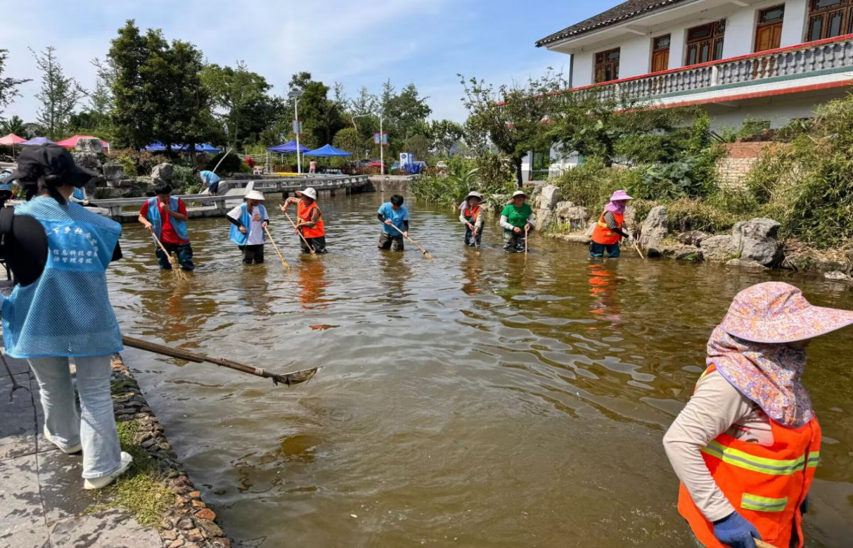 村庄道路是村民日常出行和生活的重要场所,道路的清洁直接影响村庄的整体活动。在古色古香的龙井村里,蜿蜒的小河因为人流量大等原因产生了许多的垃圾,河道污染已困扰村民多年,为此,三下乡活动队员开展河道清理活动,为当地村民解决了家门口的问题,给当地村民和游客提供一个干净的河道。实践队员们对这次活动投入了满腔的热情与专注,仿佛每一位队员都化身为河道的守护者。他们不畏辛劳,在烈日下、在泥泞中,一次次伸手,一次次弯腰,将河中的垃圾、淤泥、顽固的杂草等污染物一一清理出来。随着工作的推进,河水的富营养化现象得到了显著的改善,水质也逐渐变得更加纯净。