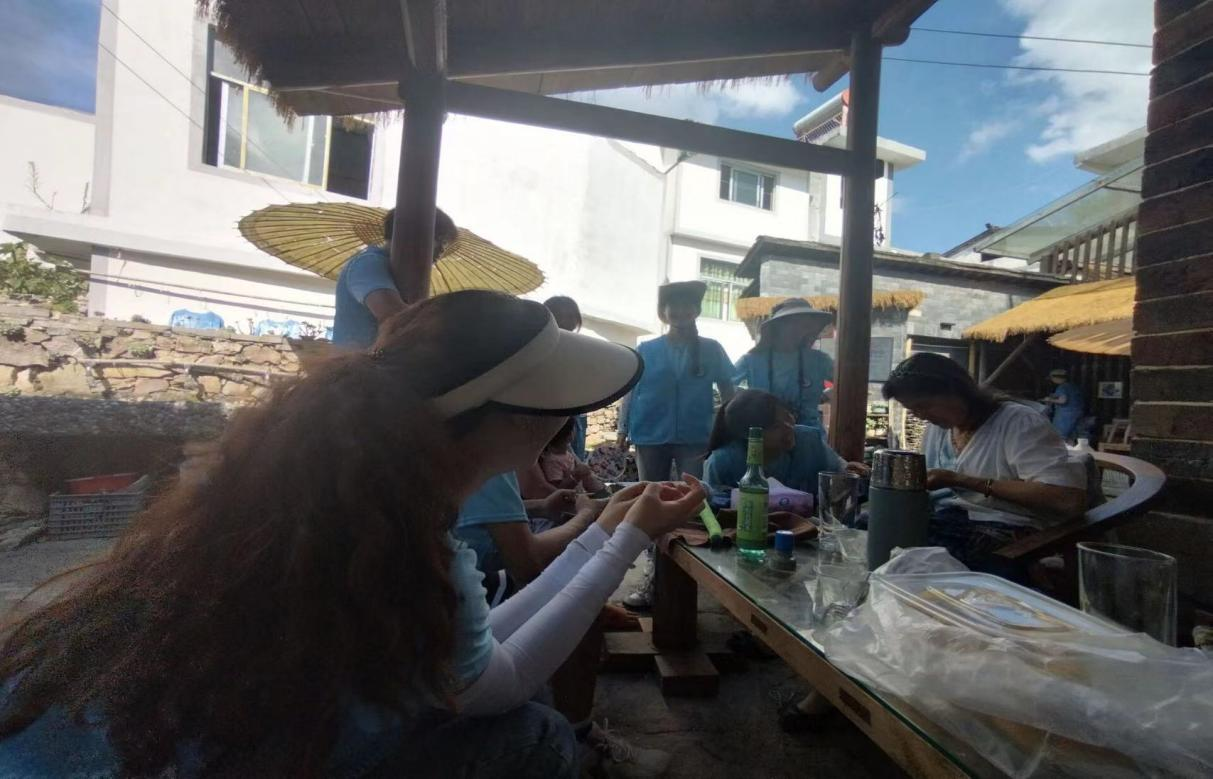 在走访过程中,队员们有幸拜访了扎染坊的坊主。这位坊主热情地介绍了非物质文化遗产—扎染,并分享了自己扎根于文艺工作的经历。他的“有茶有歌有故事”展现了其深厚的文艺底蕴和对传统工艺的热爱。通过与他的交流,队员们对扎染这一传统技艺的艺术形式、传统技艺中的创新元素以及龙井村的特色和旅游产业有了更为全面的了解。