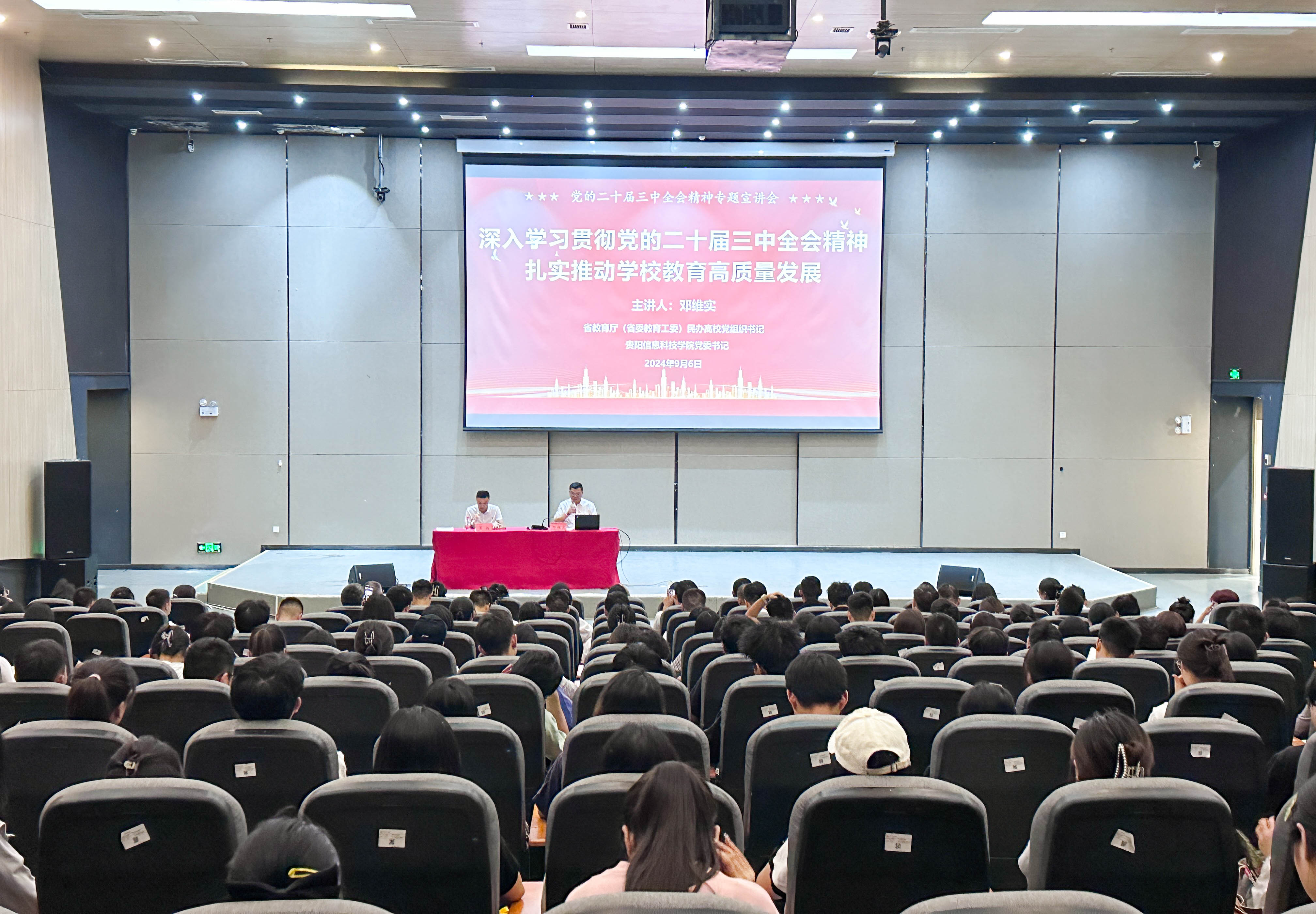新闻网讯(供稿/供图 党群工作部)9月6日上午,学校在图书馆二楼学术报告厅举行宣传贯彻党的二十届三中全会精神专题宣讲。省教育厅(省委教育工委)民办高校党组织书记、学校党委书记邓维实作专题宣讲,校办公室主任吴扬主持。beat365各党总支书记,全体行政人员、辅导员、思政课教师及学生代表共300余人参加。
