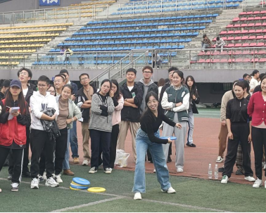 飞盘比赛活力满满,趣味十足。每个学院派十名老师参赛,一人两个飞盘,按飞盘积分累计排名。我院老师虽有初玩者,但很快掌握技巧,表现出色。