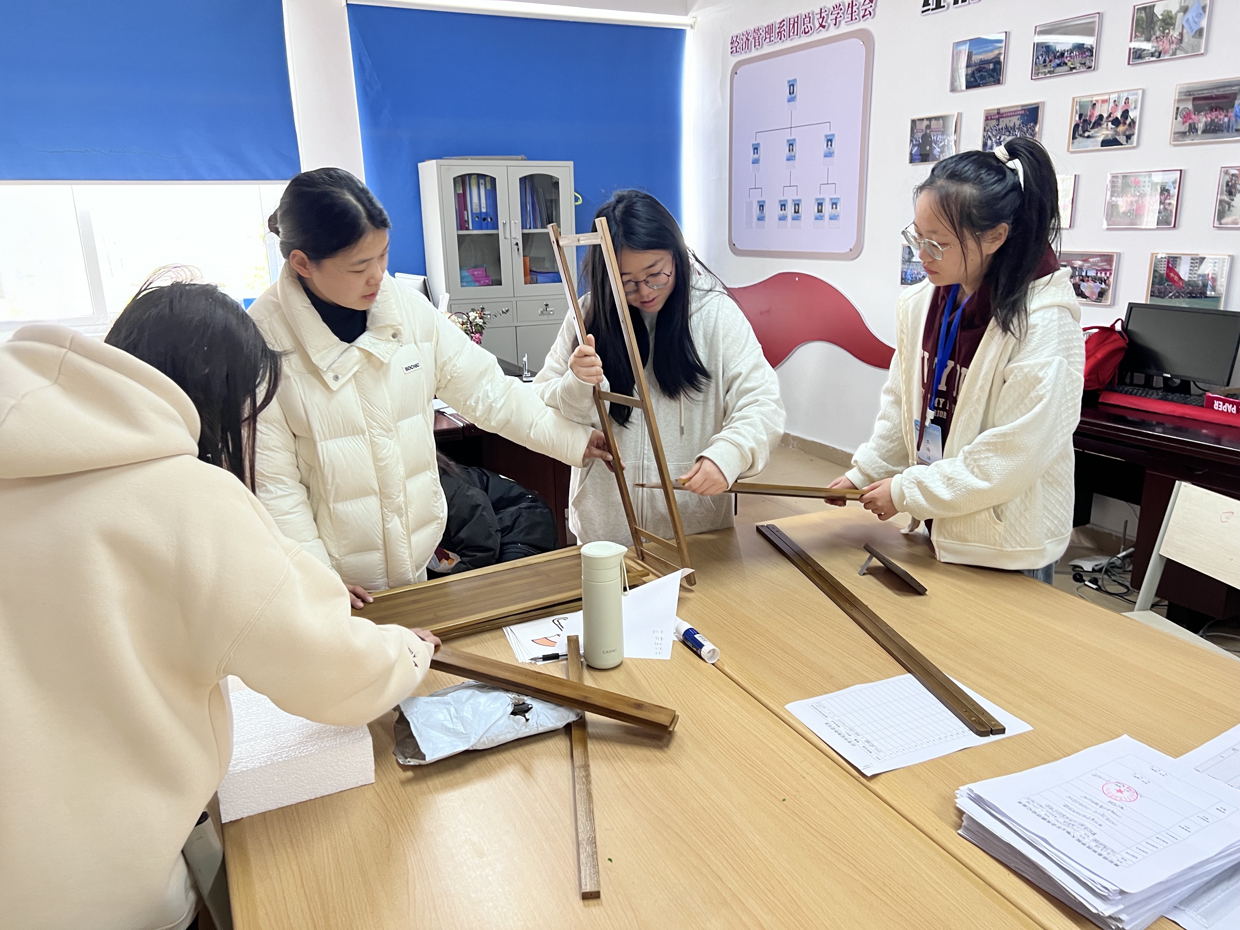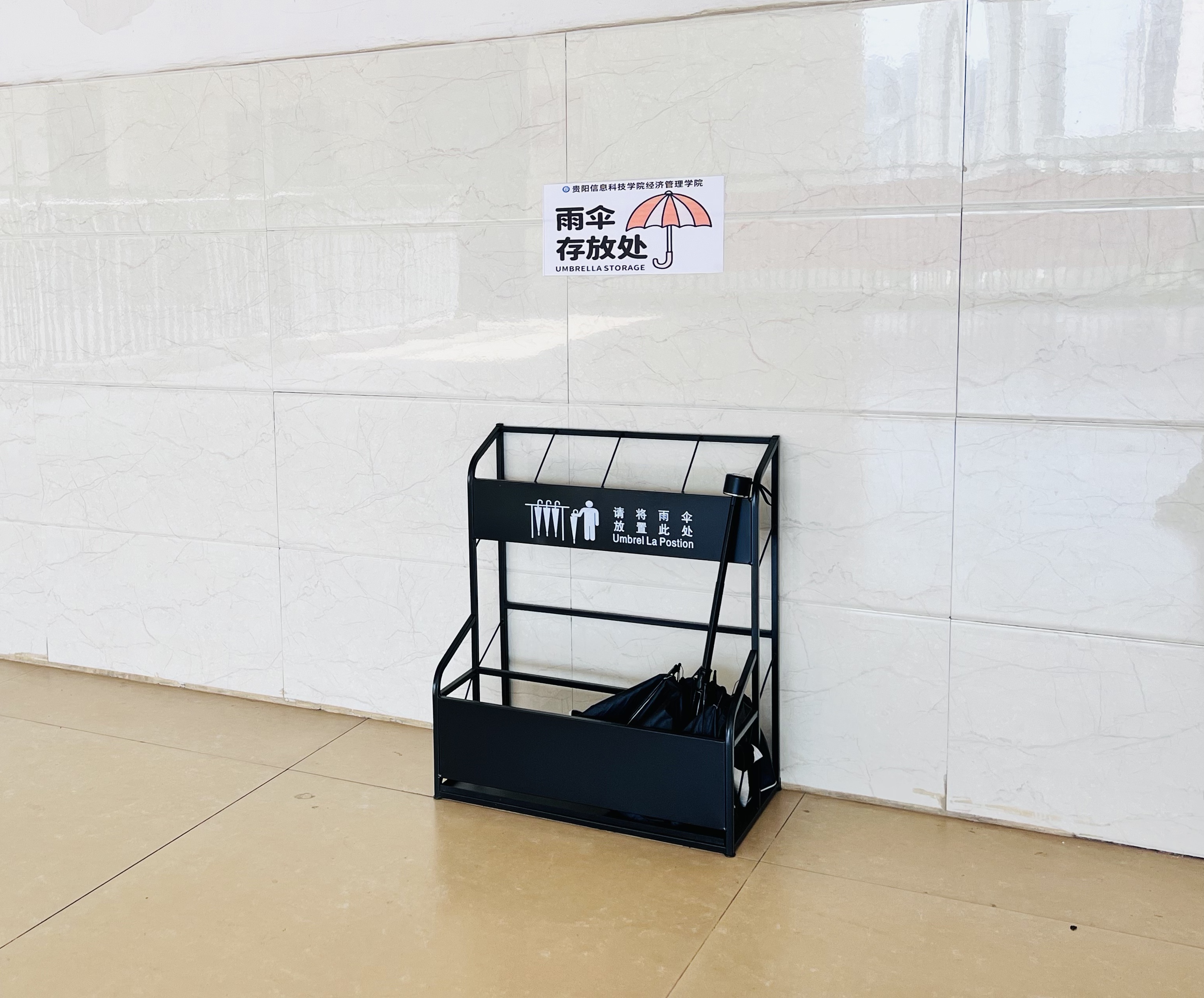 活动筹备期间,我院学生会各部门高效联动。我院学生会宣传部快速设计多版标识方案,最终选定卡通雨伞造型与校园LOGO结合的创意贴纸;我院学生会办公室比对多家供应商,定制防锈防滑的环保型伞架;我院学生会体育部、学科部和素拓部共同组建“安装突击队”,利用课余时间完成B栋5层楼所有教室的定点安装。