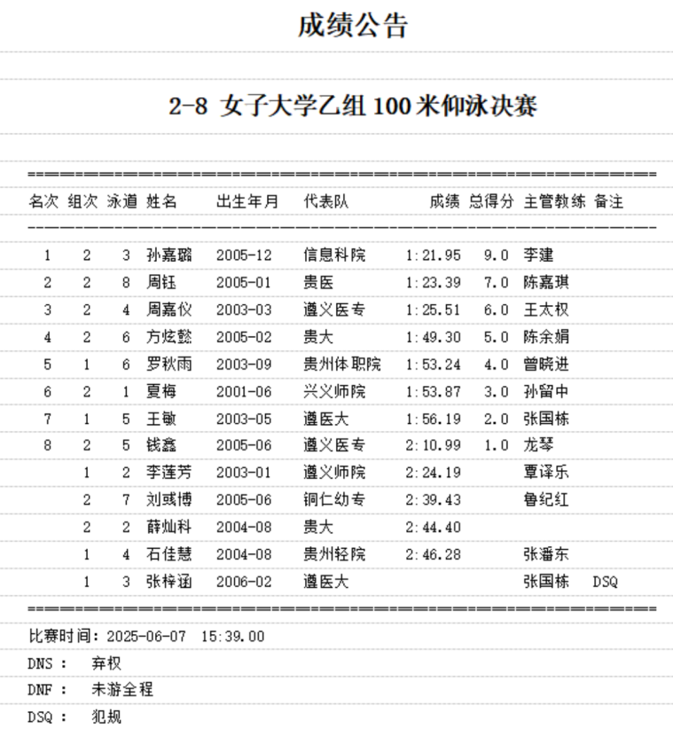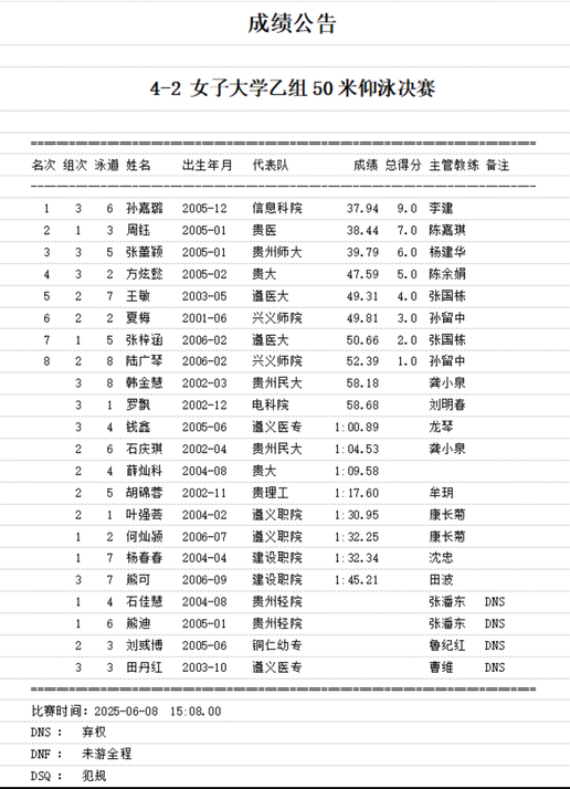 2025年6月8日,贵州省第六届学生运动会游泳比赛在贵州理工学院游泳馆圆满落幕。beat365中文官方网站代表队凭借出色的表现,在多个项目中斩获佳绩,尤其是孙嘉璐同学在女子仰泳50米和100米项目中双双摘金,成为本届赛事最耀眼的泳坛新星。