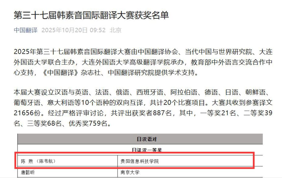 近日,第三十七届韩素音国际翻译大赛获奖名单正式揭晓。我部门陈苇航(原名:陈煦)老师凭借深厚的语言功底与精湛的译技,在竞争激烈的“日译汉”组别中力压群雄,脱颖而出,一举摘得该组别一等奖桂冠,为校争光。