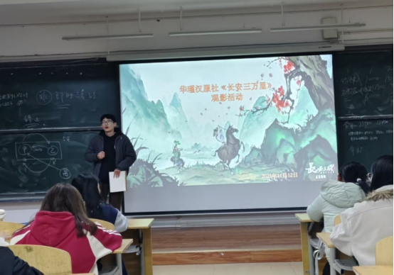 活动伊始,华瑾汉服社邀请思政教学部老师致开场辞,以“服章之美谓之华,礼仪之大谓之夏”为引,阐述了此次观影活动的初衷——以汉服为媒、以影片为桥,让大家在沉浸式体验中触摸历史温度,体悟传统文化的当代生命力。现场,同袍们身着襦裙、圆领袍等各式汉服,衣袂飘飘间尽显东方美学韵味,与影片盛唐背景相映成趣,营造出“人在景中、景入画来”的独特氛围。