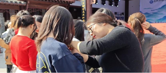 随后,活动进入入党宣誓环节:全体新党员面向党旗肃立,由党群工作部部长韩雪、学生工作部部长张吉林、思政教学部覃维华、团委王雯雪老师带领新党员们进行庄严宣誓;同时青年学子行传统冠笄之礼,正衣冠、明人伦的古仪,与“为人民服务”的誓言相映,让“修身齐家”的文化传承与“治国平天下”的时代使命,在青年身上实现了生动融合。