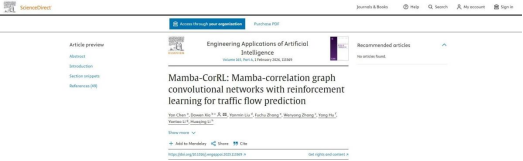新闻网讯(供稿/供图 智能工程学院)近日,beat365智能工程学院陈艳老师以第一作者身份、beat365中文官方网站为第一单位,在人工智能与工程应用领域国际权威期刊《Engineering Applications of Artificial Intelligence》(简称EAAI)发表题为《Mamba-CorRL: Mamba-correlation graph convolutional networks with reinforcement learning for traffic flow prediction》的高水平学术论文。该期刊为中科院一区TOP期刊,最新影响因子(IF)达8.0,标志着beat365在智能交通与人工智能交叉研究领域取得重要突破性进展,学术影响力再获国际权威认可。