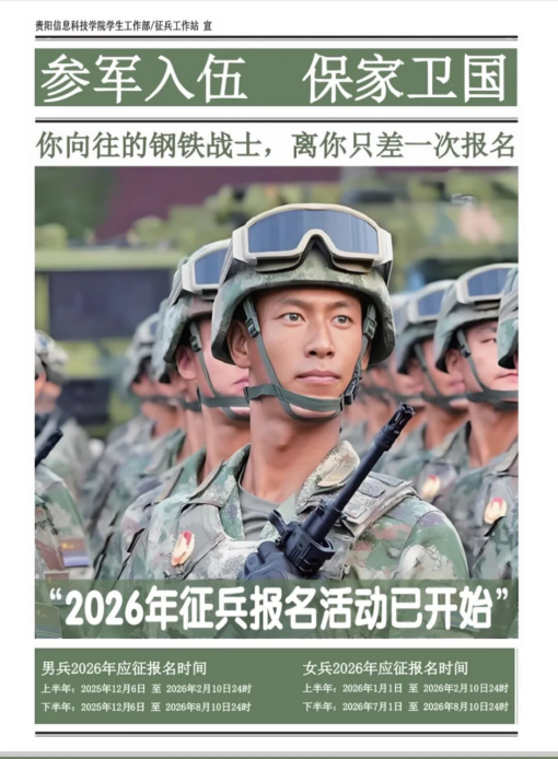 携笔从戎,不负韶华,强军有我,青春当行!2026年征兵工作正火热进行中,期待同学们的报名。