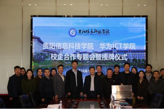 新闻网讯(供稿/供图 信息工程学院)近日,学校与华为ICT学院在图书馆会议室举行校企合作专题会暨授牌仪式。华为贵州产业发展与生态部人才经理孙文翔、北京博海迪信息科技股份有限公司等企业代表,学校执行校长王颖华,信息工程学院党政负责人及教师代表参加了本次仪式。