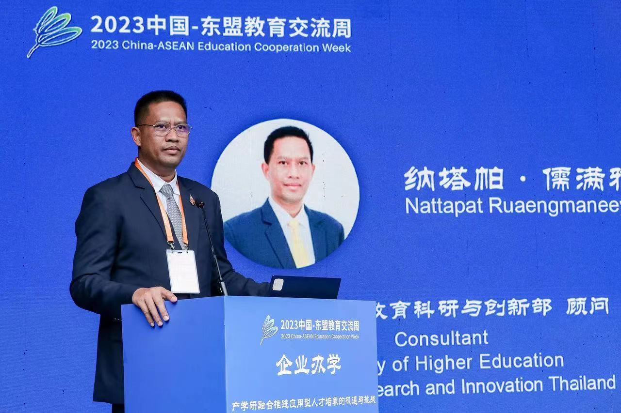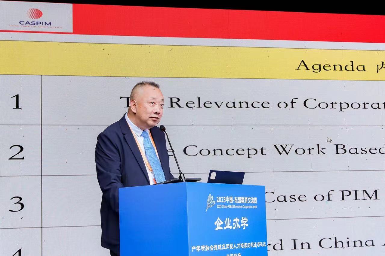 Dr. Nattapat Ruaengmaneeya, Consultant to the Ministry of Higher Education, Research, and Innovation of Thailand, objectively and comprehensively explained the opportunities and challenges that Thailand faces in industry-university collaboration. Dr. Nattapat stated that the innovative development of industry-university collaboration calls for joint efforts from both educational institutions and enterprises, where the collision and integration between educational and industrial thoughts may spark new ideas, driving innovations led by industry. Under the theme of the forum, Prof. Tang Zhimin, the Assistant President of PIM and Director of the China-ASEAN Research Center of PIM explained the advantages of employment-oriented education and the role of dual mentors from both universities and enterprises in talent development. He suggested that universities should look into the future in the China-ASEAN context, establishing a China-ASEAN Enterprise-run University and College Alliance to share international educational resources, discuss latest educational models and beliefs, and set quality standards for China-ASEAN enterprise-run universities and colleges. Dr. Carmela S. Dizon, the Director of Alumni Affairs and Career Services at Angeles University Foundation of Philippines, emphasized the need for comprehensive vocational education integrated throughout university career. She advocated for establishing bridges between students and companies for better understanding their employment needs through diverse channels, and optimizing talent development models to achieve precise alignment between industry demands and educational offerings.