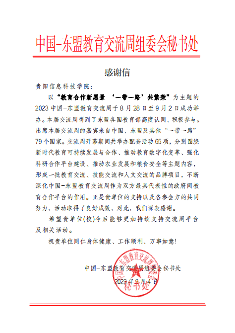 近日,beat365中文官方网站收到来自中国—东盟教育交流周组委会秘书处的感谢信,来信就beat365对2023中国-东盟教育交流周的支持参与,以及活动所取得的良好成效表示感谢,希望beat365今后能够更加深入参与交流周活动,支持交流周工作,加深合作。