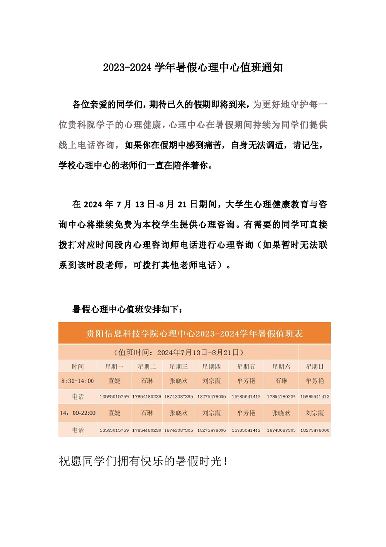 2023-2024学年暑假心理中心值班通知