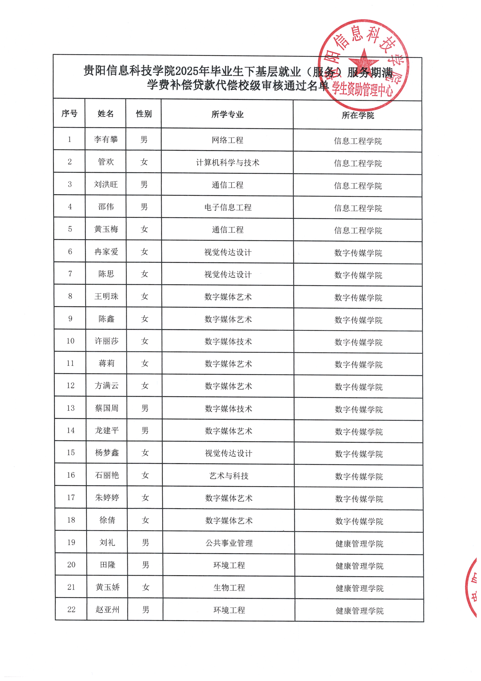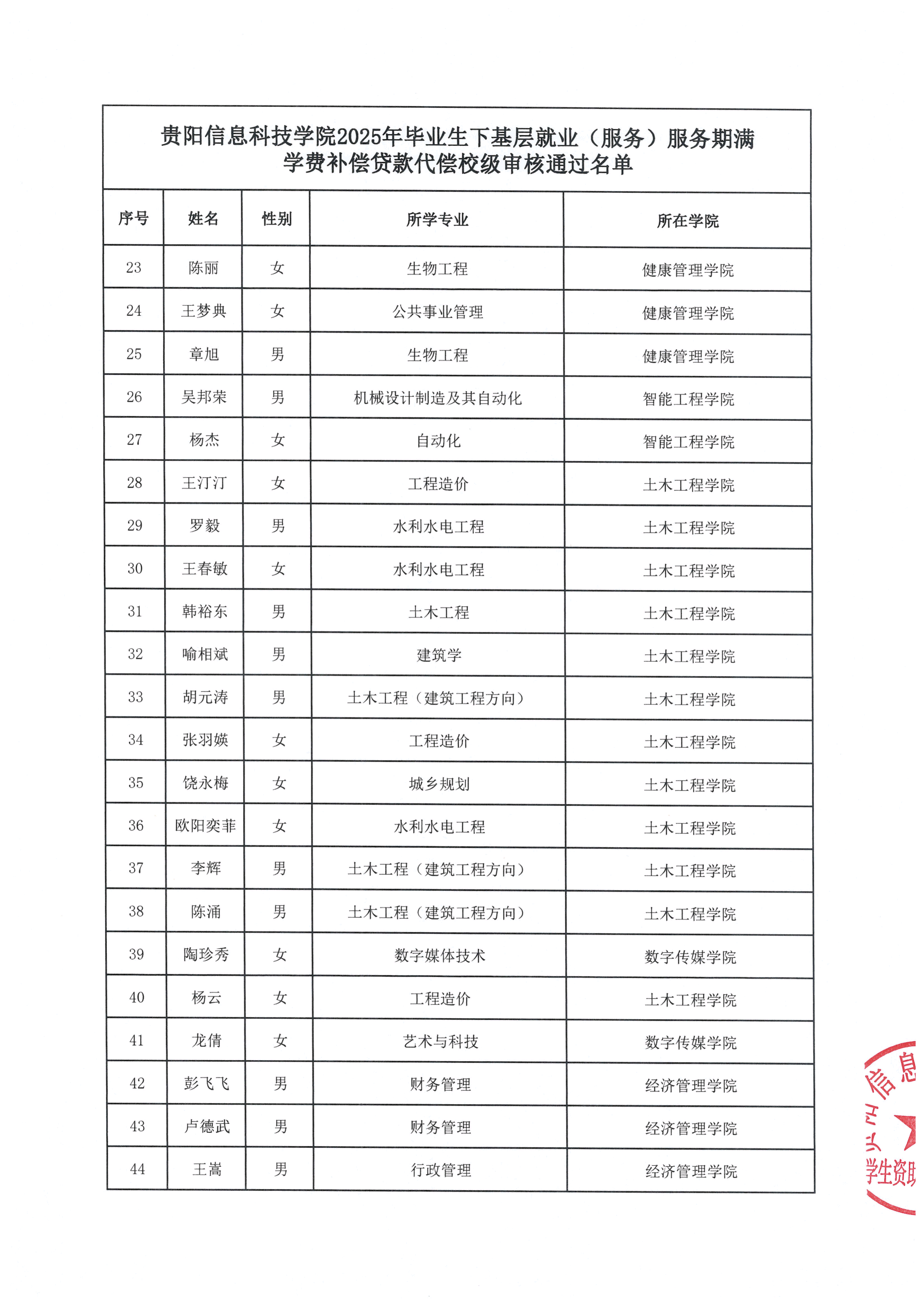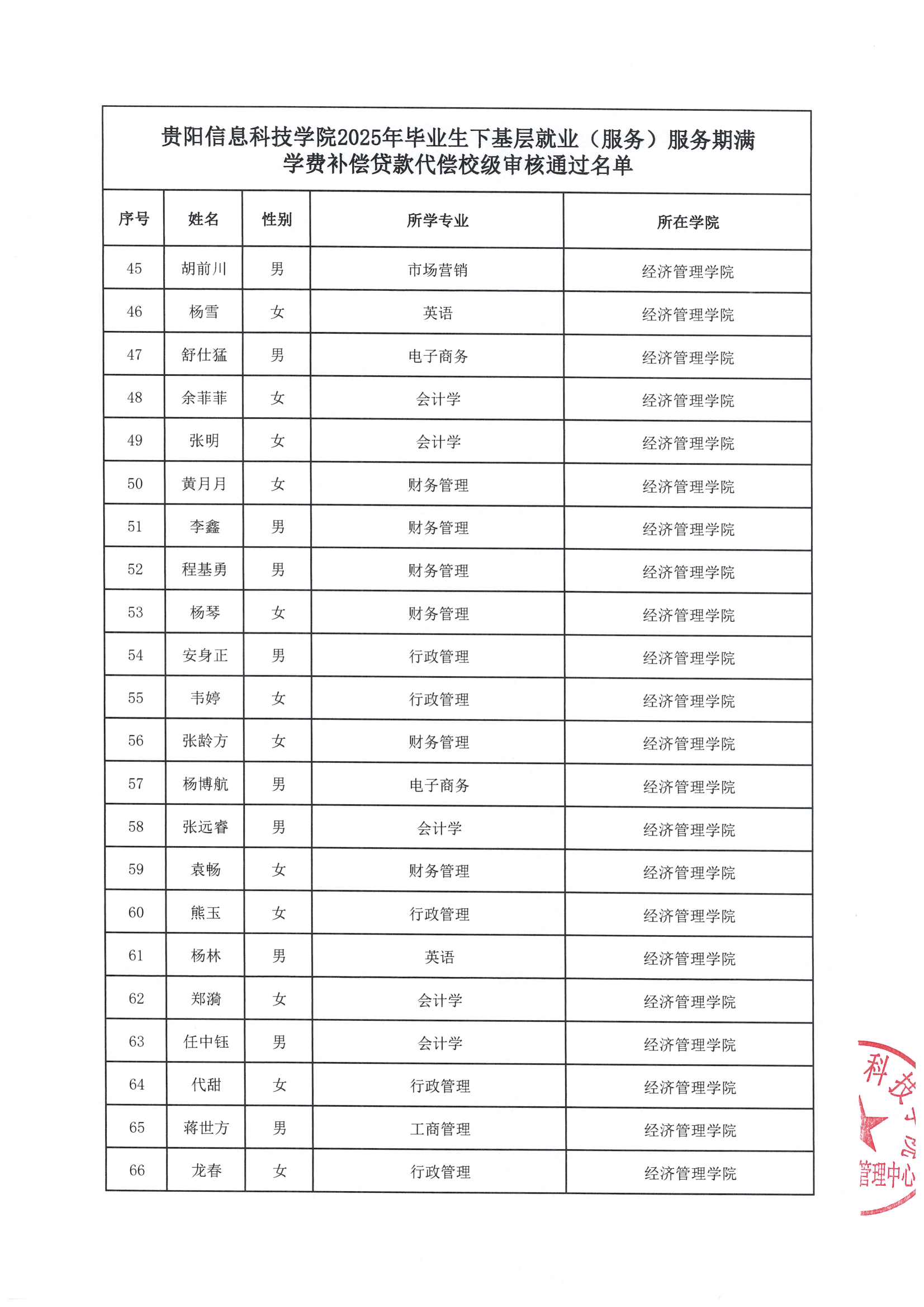beat365中文官方网站2025年毕业生下基层就业(服务)服务期满学费补偿贷款代偿校级审核通过名单公示