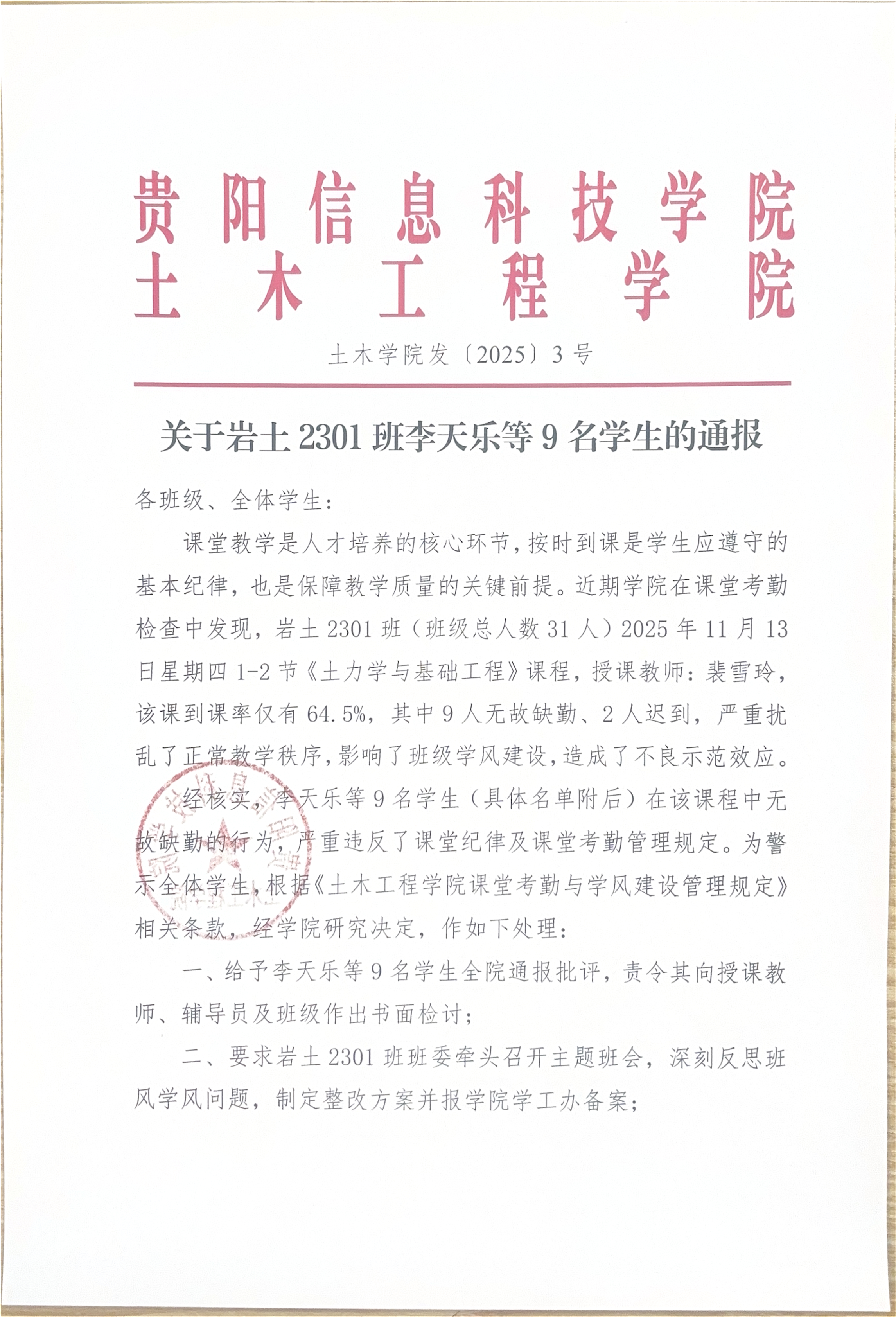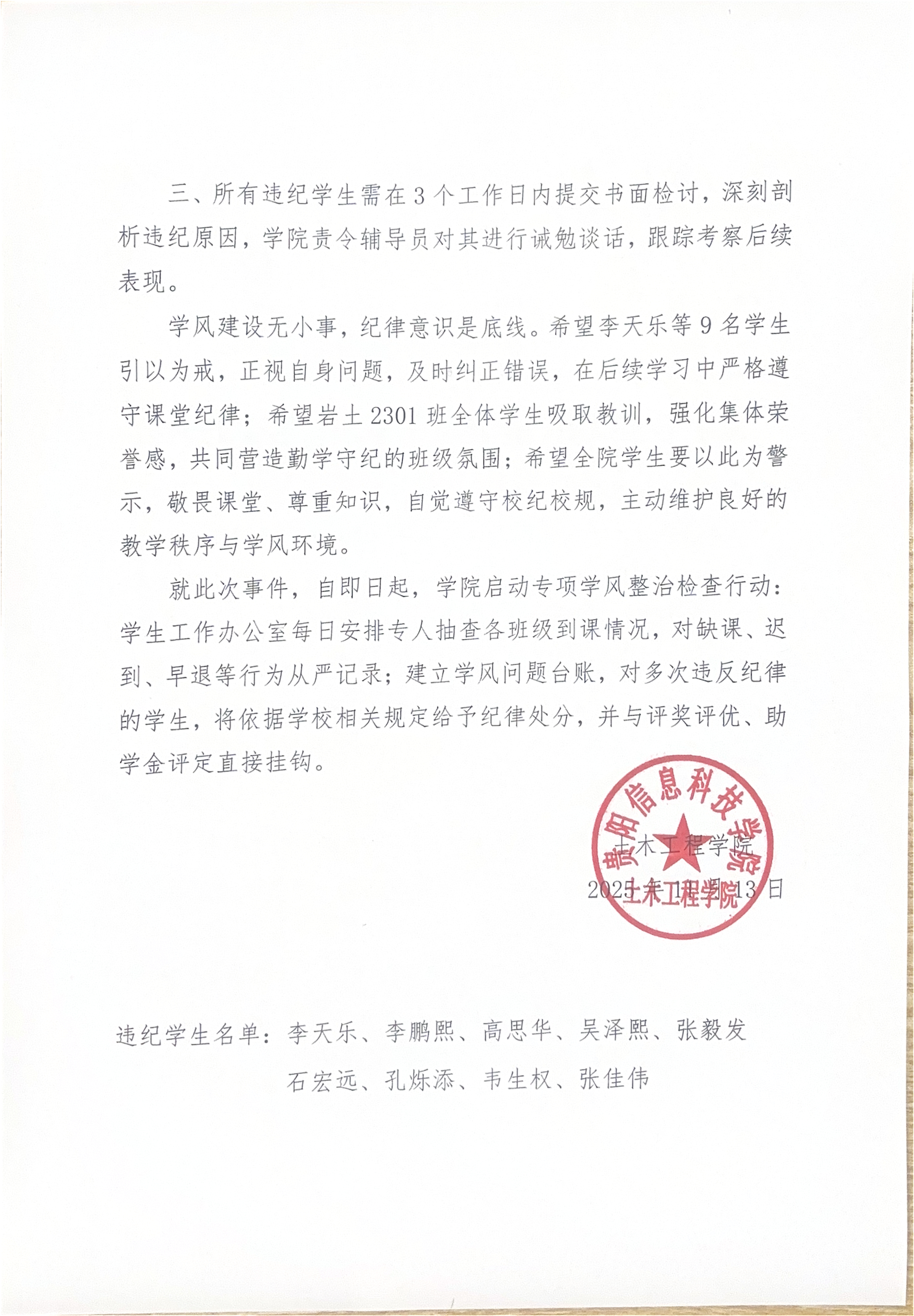 beat365中文官方网站土木工程学院关于岩土2301班李天乐等9名学生的通报