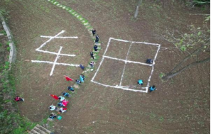 在青山环抱、碧水相邻的车田村田间地头,师生们迅速投入劳动实践:有的挥锹翻整土地,有的用白灰在田间勾勒出巨型“车田”字样,还有的分工协作播撒菜种。蓝白相间的志愿马甲与田野交织成景,青春的身影与乡村风光相映成趣,洋溢着蓬勃的生命力。
