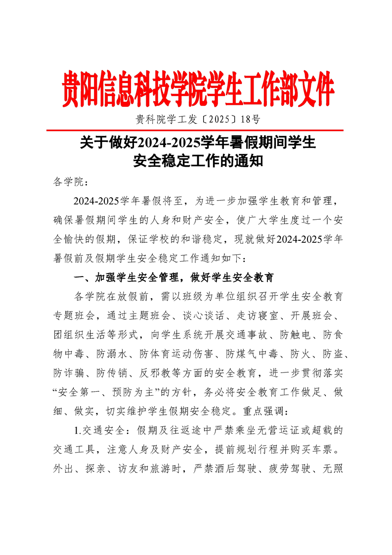 关于做好2024-2025学年暑假期间学生 安全稳定工作的通知