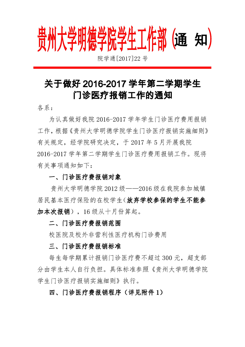 关于做好2016-2017学年第二学期学生 门诊医疗报销工作的通知