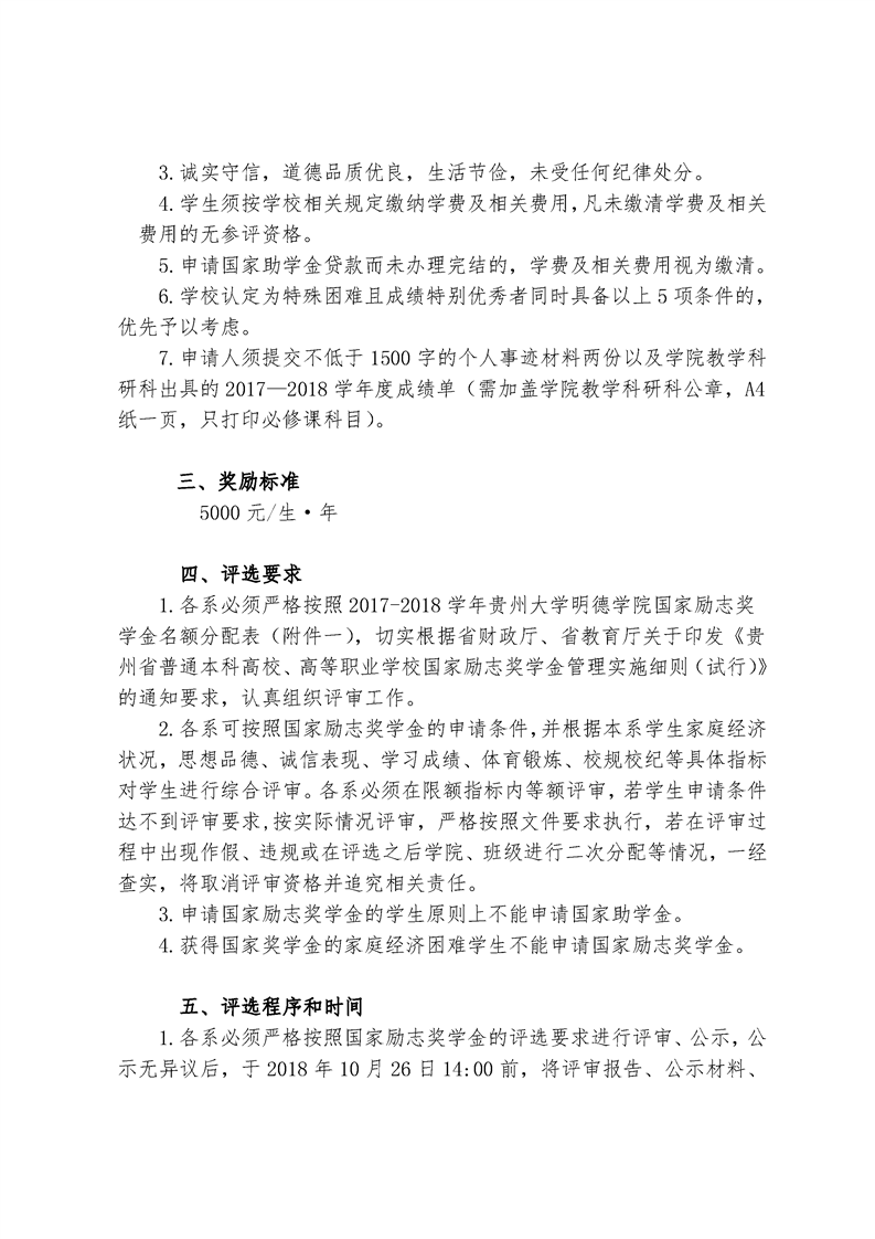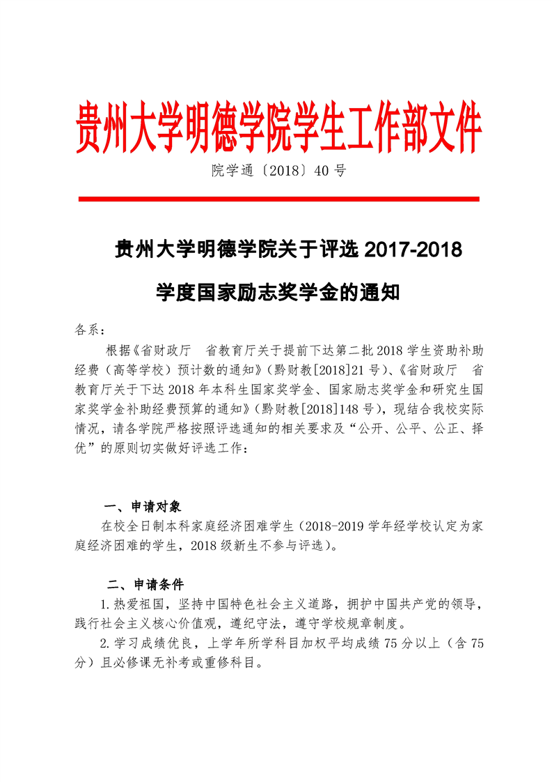 关于做好贵州大学明德学院2017-2018学年国家奖学金评选工作的通知